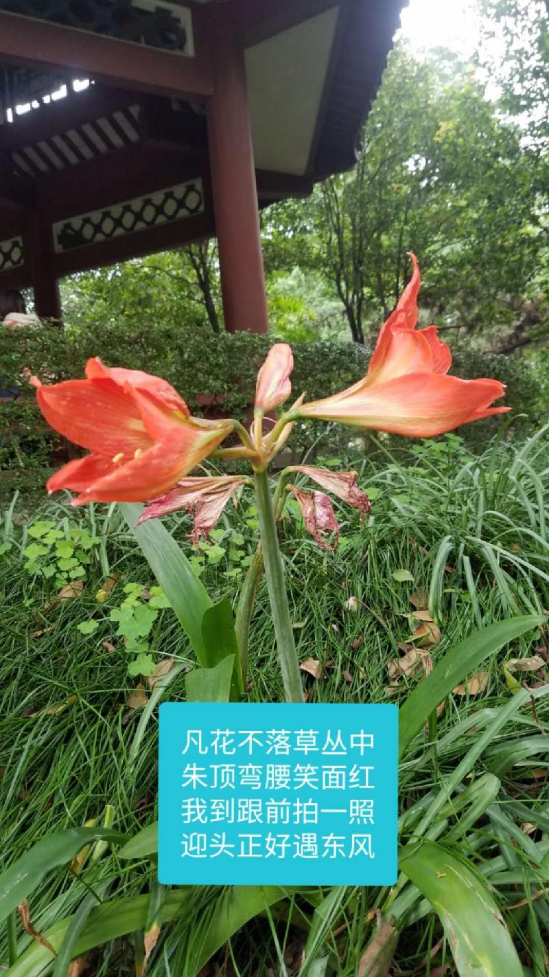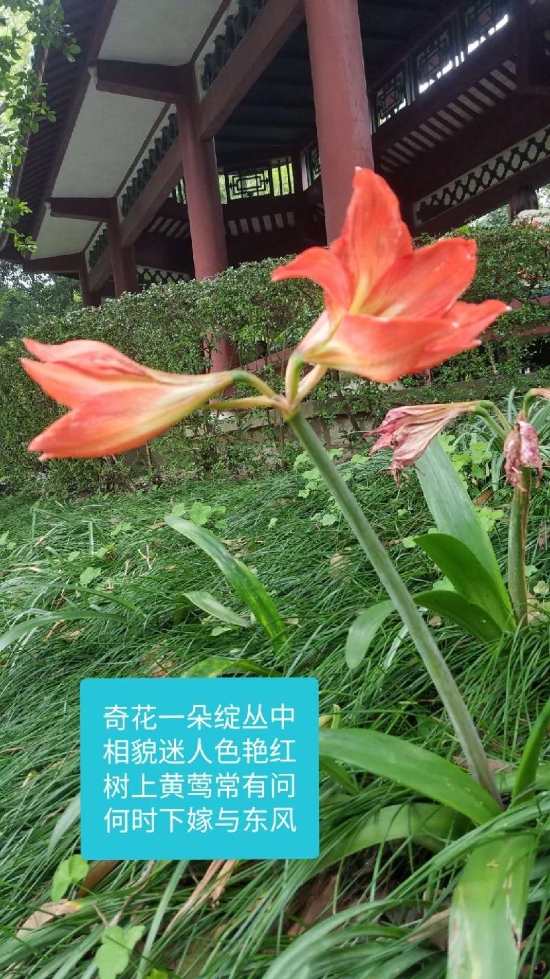 下图的花卉名“朱顶红”,原产巴西墨西哥,今全国全球均有栽种,适合园栽或盆栽。图中的朱顶红长于广西柳州市柳侯公园(广西唯一四星级公园)柑香亭旁。园和亭为柳州人为纪念柳宗元在柳任刺史一职期间所建的丰功伟绩而建。柳宗元在柳期间植柳,种柑,挖井,兴学,释奴,鞠躬尽瘁。死后被当朝皇帝谥为文惠侯。朱顶红意为:被爱,求爱,爱得热烈,象殷红的血一般。今在下从所著的“花之恋(1200多首诗)”中择其中二首(幅)诗配画(朱顶红)献于众卿一阅。