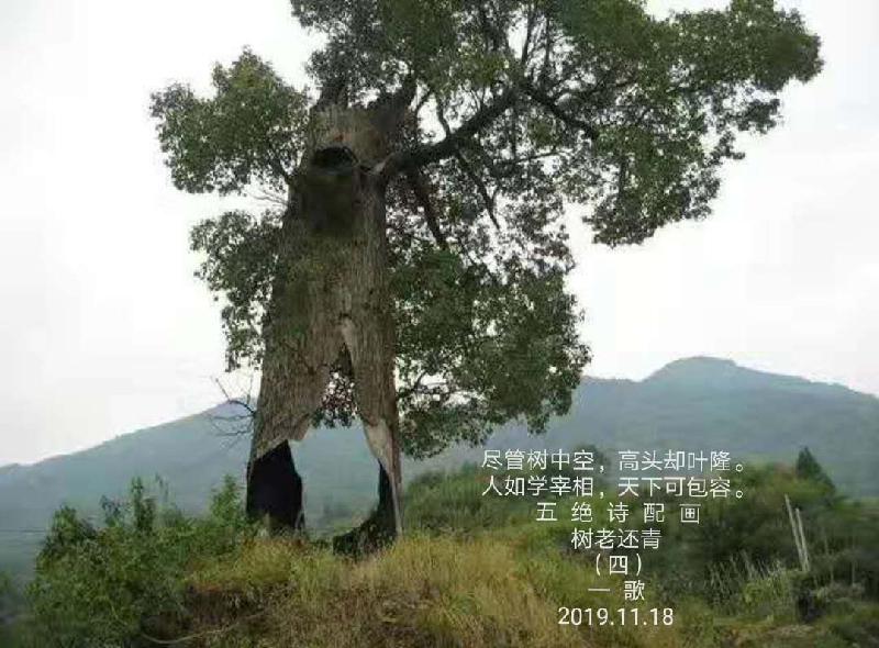 下图中的一棵老树长在深山,树身只剩下一副皮囊,底下腹中空空却高头枝繁叶茂,生命是何等顽强。在下看后亦是感触良多,据此抒怀赋诗十首,择其中三首以示众卿。