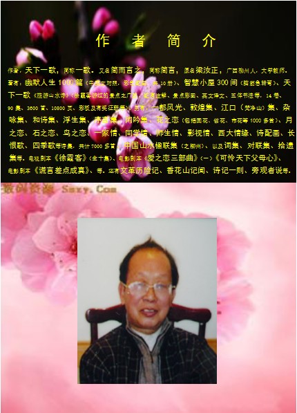 作者简介,天下一歌,简称一歌。又名简而言之,简称简言,原名梁汝正,广西柳州人,大学教师。