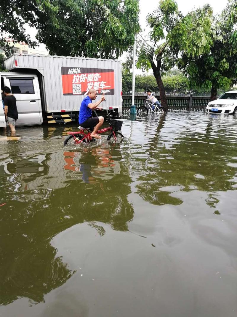 对面那个小伙还不如这位大叔,大叔竟然敢在大水中单手骑车,并稳稳当当地驶过。