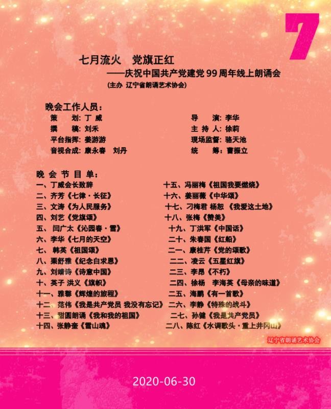 6月30日晚7时,辽宁省朗诵艺术协会在官方微信群里举办了“七月流火 党旗正红——庆祝中国共产党建党99周年”线上朗诵会。本次朗诵会邀请到了齐芳、文涛、陈红、刘艺、李华、 李静、李昂等辽沈资深朗诵艺术家参与献诵,其他演员通过协会内部会员竞争产生。