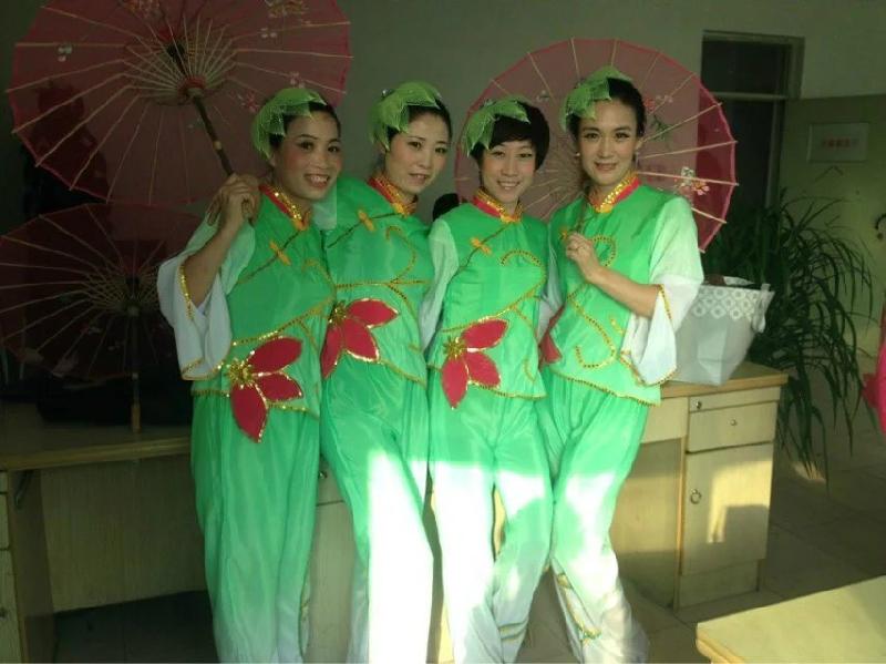 从此我们开始了市里义务演出的艰难路程。没有资金,没有设备,没有服装道具,我们师生齐心协力,自己凑钱买服装,买鞋子,买道具,买化妆用品等等。平均年龄四十一二的我们,艰苦的排练中累的浑身酸疼,好几个姐妹加上老师姐姐腿疼的都无法上楼,更令人头疼的是有个别姐妹因为家事繁忙,在得不到家人的支持情况下克服万难,说服家人,积极的参与排练演出。每一个节目排练成功都饱含着老师姐姐和姐妹们无数的辛勤汗水和激动泪水。在没有任何物质回报的情况下一场场成功演出,是姐妹们唯一的快乐和安慰。