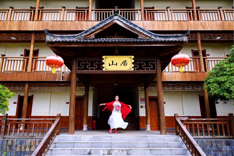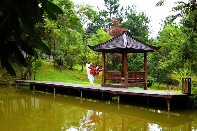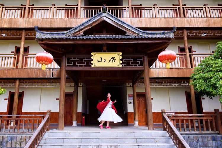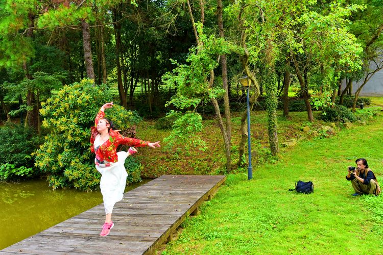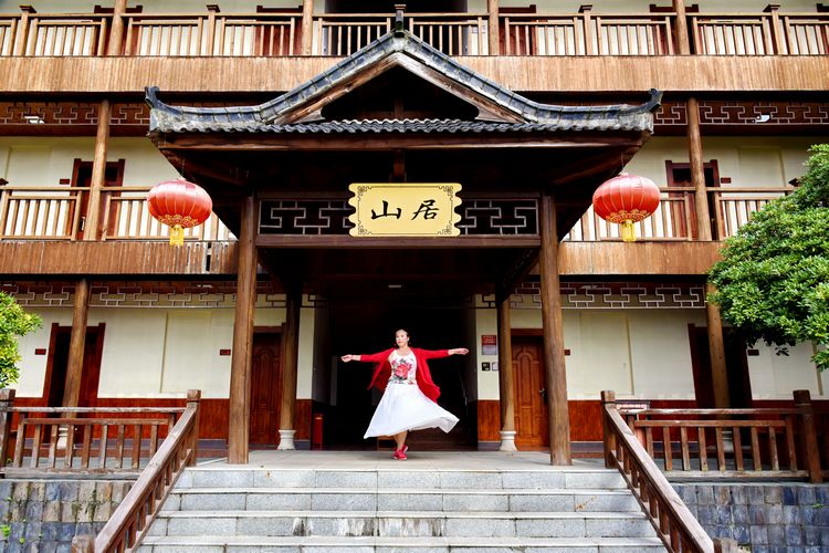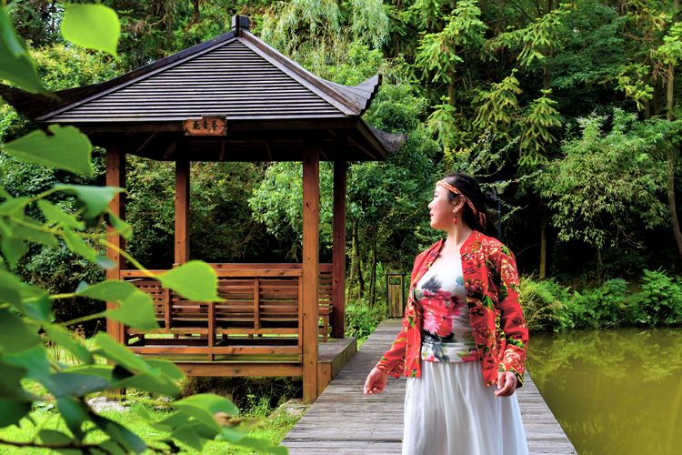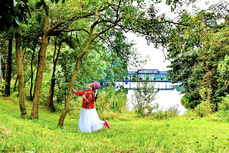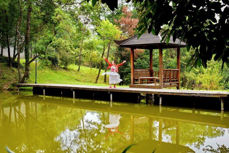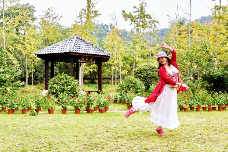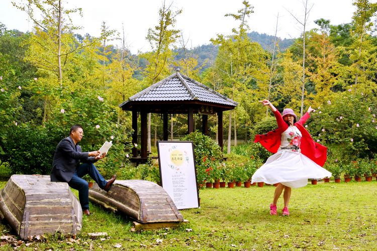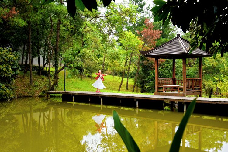 武汉黄陂花乡茶谷旅游度假风景区,景色迷人,红衣女子舞在其中,乐而忘返。