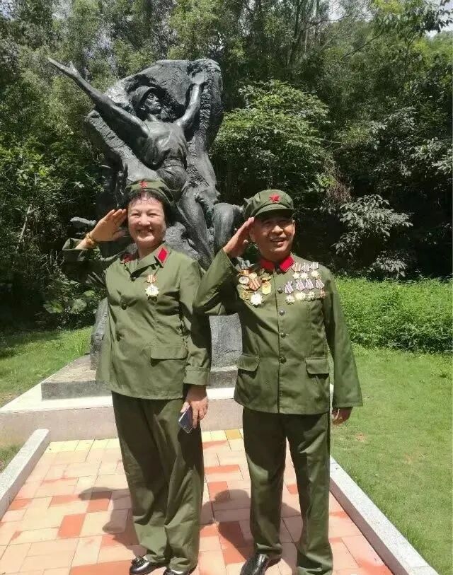 孙建华和深圳另一位多次立功受奖的基建工程兵女战友孙兆华相逢于笔架山基建工程兵铜像前。