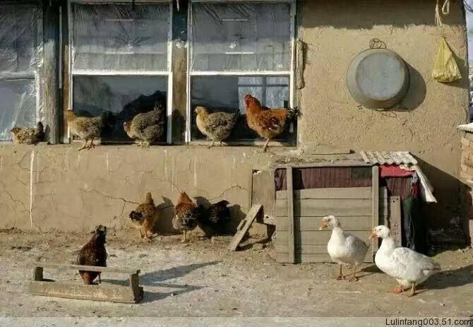 农家往日纸糊窗,鸡鸭悠闲绕土墙。