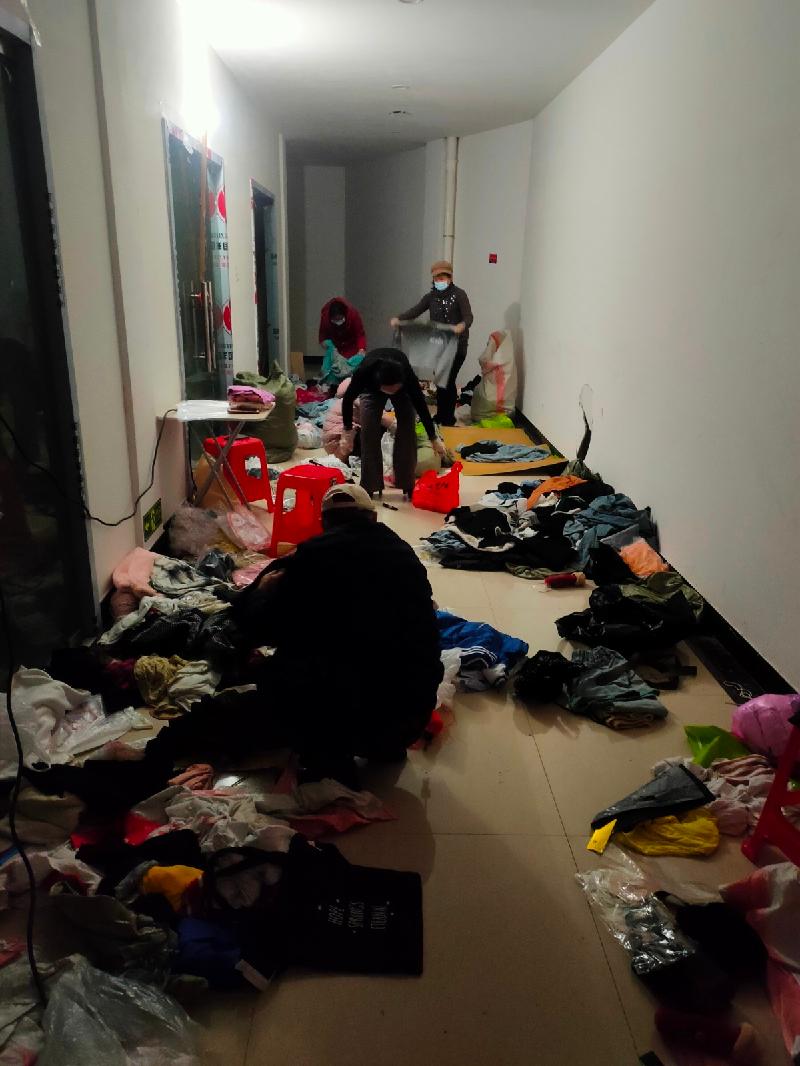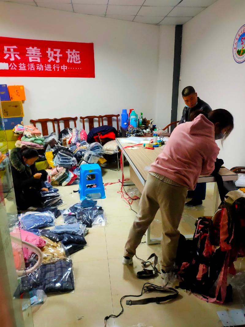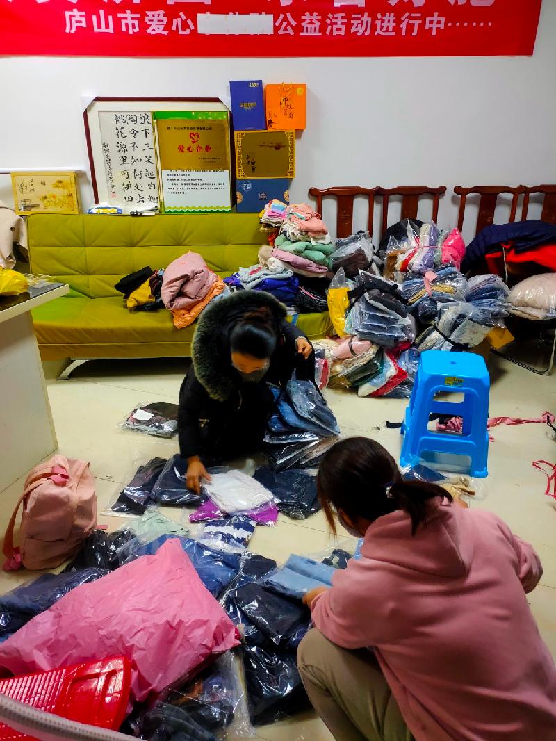 庐山市爱心蓝协会的志愿者们,今天下午一直忙到现在,将衣服消毒后再分类整理打包,由庐山市爱心蓝协会将这些物资发放贫困学生,希望这些衣服能让贫困学子温暖地度过寒冬。