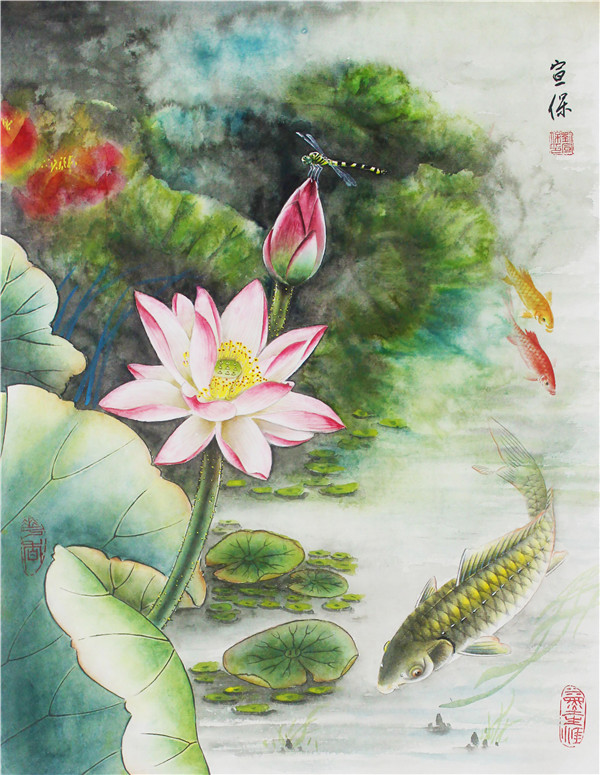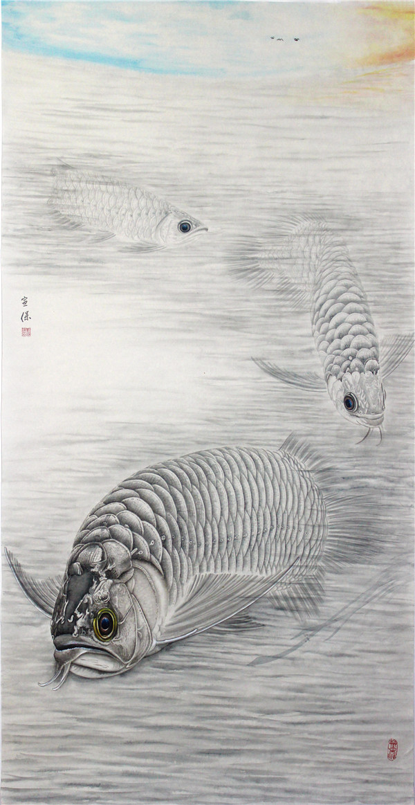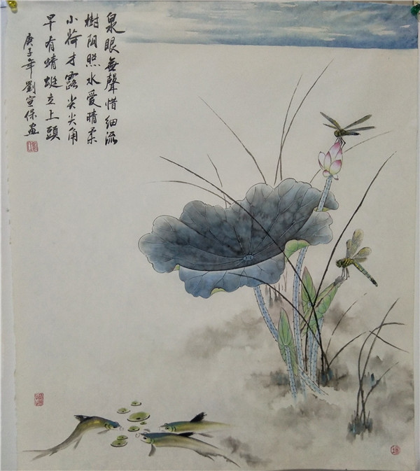“画鱼须得活泼,得其游泳像。见影如欲惊,硷喁意闲放。浮沉荇藻间,清流姿荡漾。悠悠羡其乐,与人同意况。若不得其神,只徒肖其状。虽写溪涧中,不异砧俎上。”刘宣保画作深得其妙。鱼儿在长满水草的水中,自由自在地漫游着,或聚或散,或浮或沉,轻巧灵动。碧水荡漾,萍藻摇曳,极其鱼水之乐。