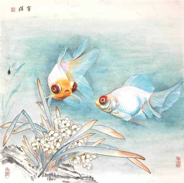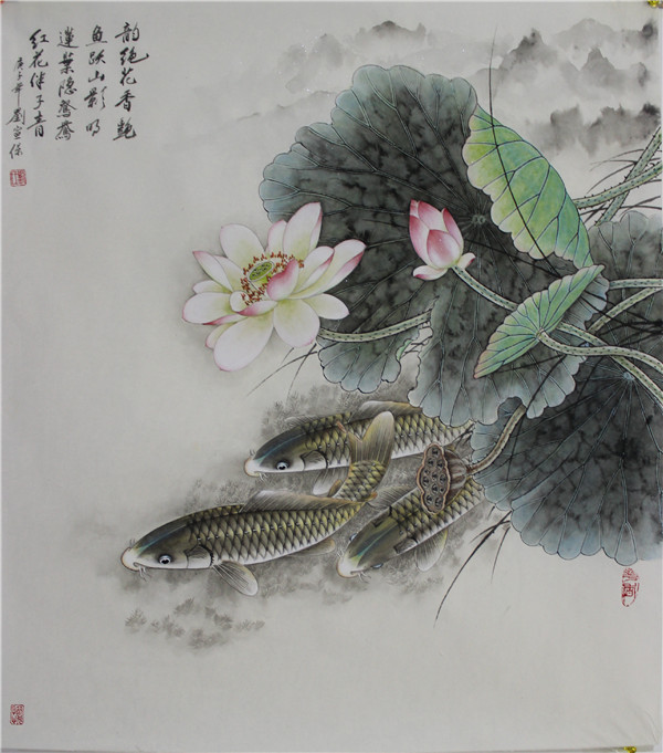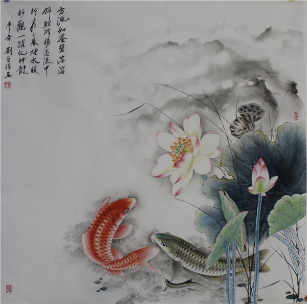 “画鱼须得活泼,得其游泳像。见影如欲惊,硷喁意闲放。浮沉荇藻间,清流姿荡漾。悠悠羡其乐,与人同意况。若不得其神,只徒肖其状。虽写溪涧中,不异砧俎上。”刘宣保画作深得其妙。鱼儿在长满水草的水中,自由自在地漫游着,或聚或散,或浮或沉,轻巧灵动。碧水荡漾,萍藻摇曳,极其鱼水之乐。