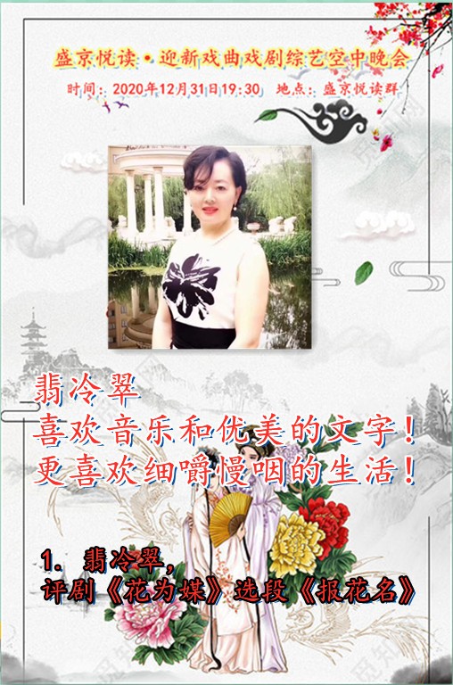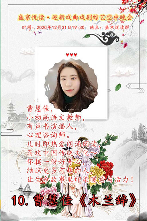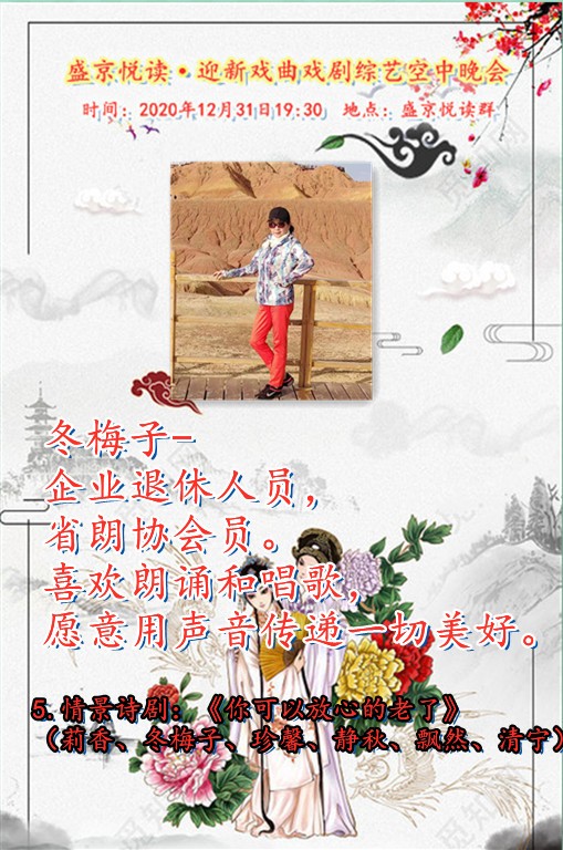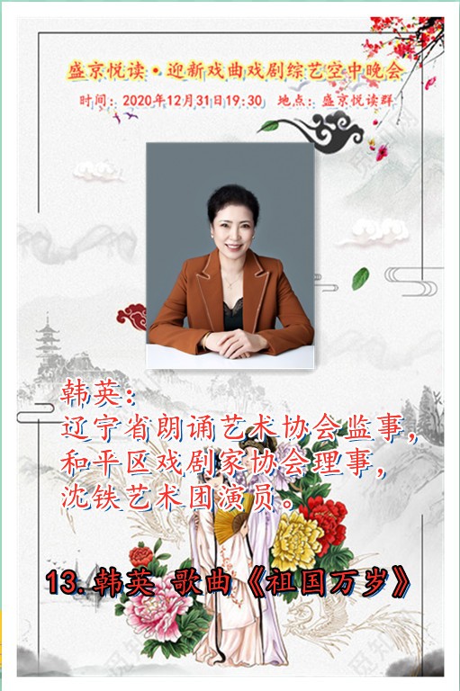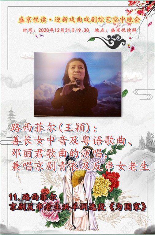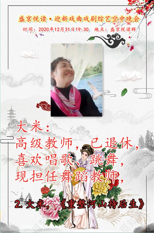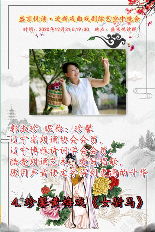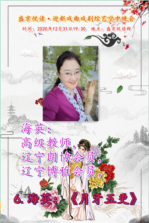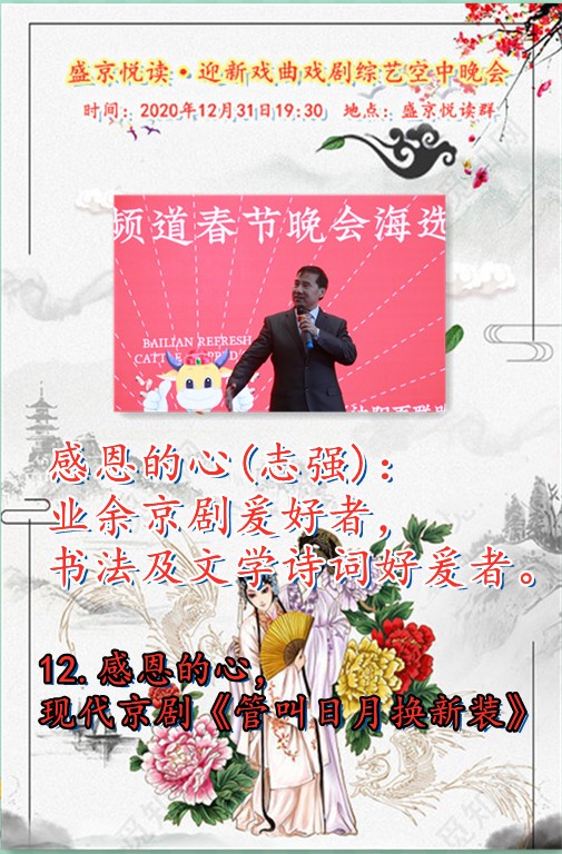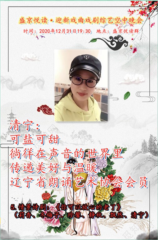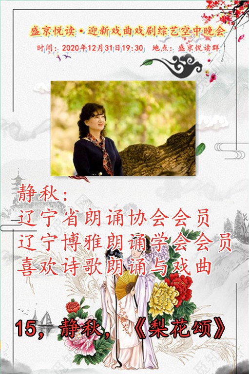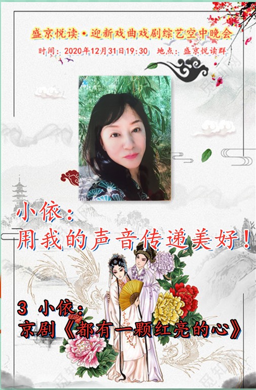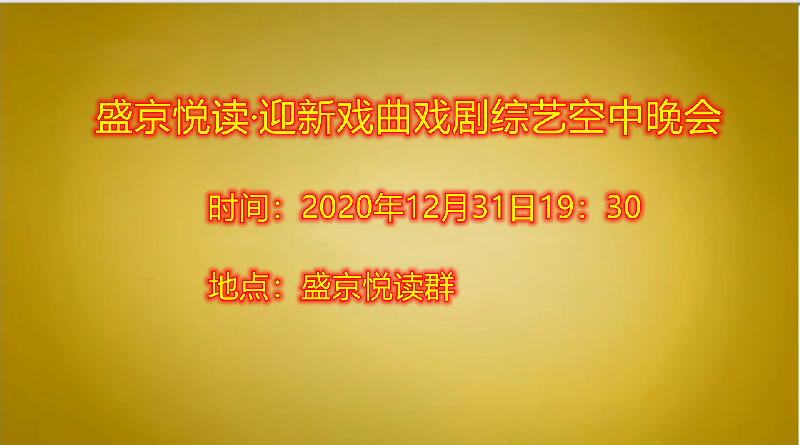 今天是12月31日,在这辞旧迎新之余,盛京悦读50、60、70及80后联手合作为诵友们呈现了这场【盛京悦读首届迎新戏曲戏剧综艺空中晚会】。晚会精彩纷呈!欣赏之余更是能够聆听与体会到全体演职人员为大家送到的祝福与心愿,表达了大家同祝愿2021新年好的心声。还有几个小时2021的钟声就要响起,让我们细细的回味 ,开心的走在每一个同频共行的好时光里吧……