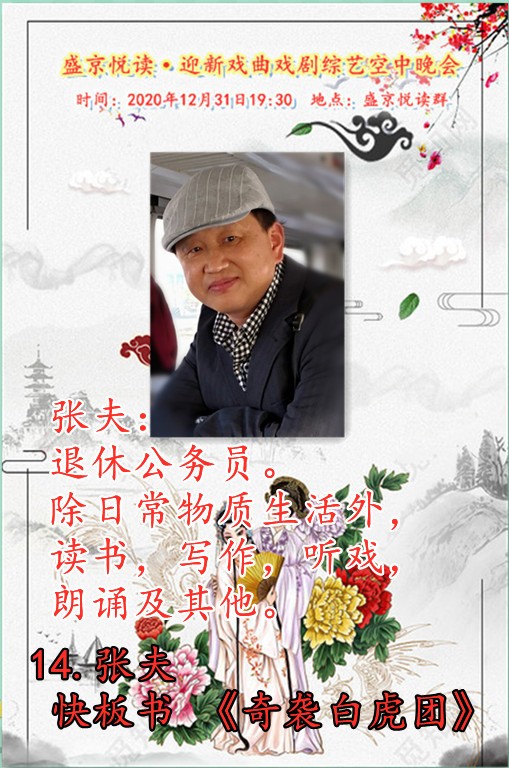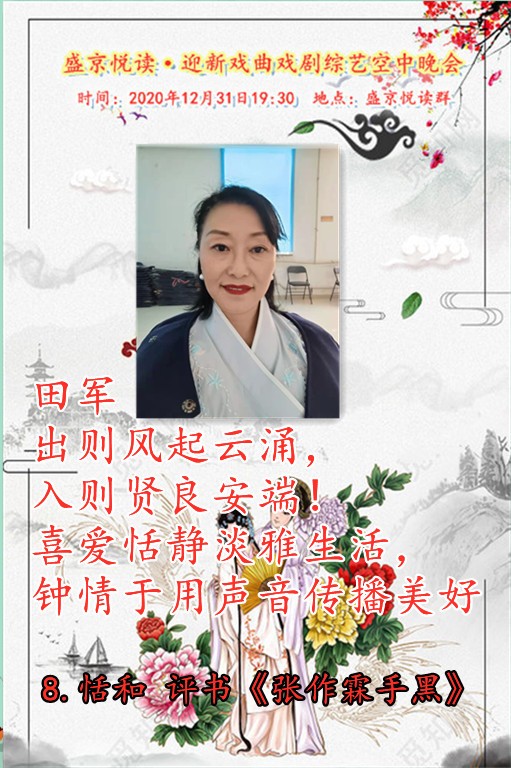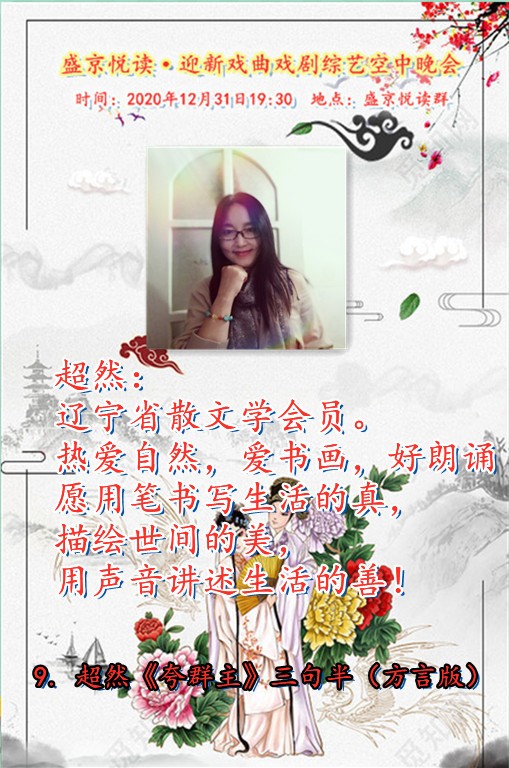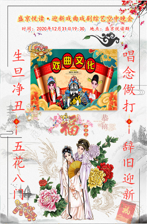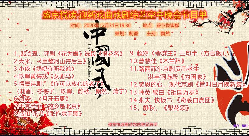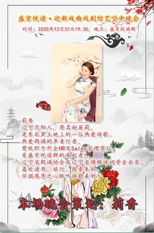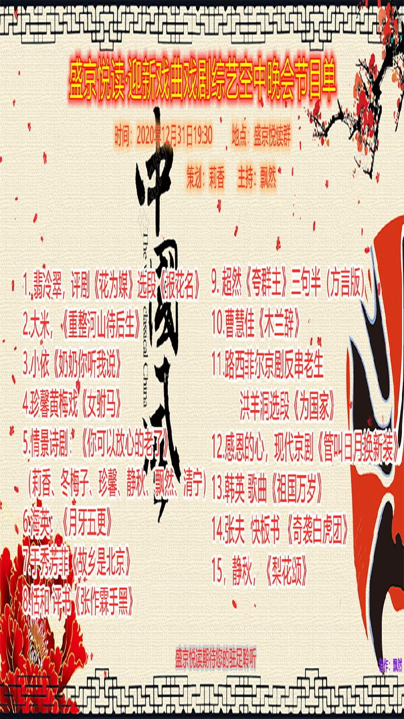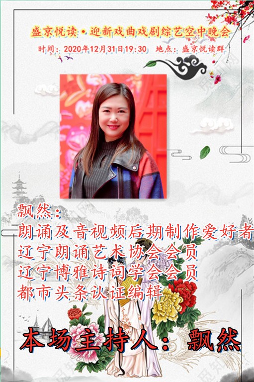 恭贺盛京悦读首届迎新戏曲戏剧综艺晚会圆满落下帷幕!感谢主持人兼后期制作飘然老师精彩的主持和制作!感谢全体演职人员精彩的演绎!感谢盛京悦读全体在线聆听欣赏的各位老师!