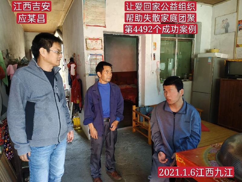 2016年2月被北京市大兴区救助站救助,2019年12月20日由河北衡水救助站张士巧联系让爱回家江西九江队队长杨毓华,2019年12月26日杨毓华通过九江市让爱回家寻宝宝回家志愿者服务队负责人脸识别的志愿者做人脸认别确定其家庭详细地址,联系到该村宁村支书,联系到其亲人。因疫情原因,在2O20年11月5日应某昌回到老家吉吉安永丰。