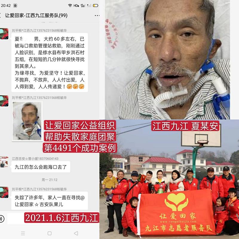 元月4日晚上8:52九江市让爱回家志愿者服务队队长杨毓华收到东莞志愿者滕桂平转发的海口救助管理站求助夏冬安亲人信息后,九江市让爱回家志愿者服务总队启动应急预案,通过九江市让爱回家负责人脸识别的志愿者做人脸识别,寻找到是修水县布甲乡洪石村五组人,九江市志愿者服务总队队长杨毓华立即联系了修水让爱回家修水支队长陈海峰,在短短的几分钟就很快寻找到其亲人。夏冬安失踪10多年(户籍也被注销),孤家老人,五保户,家人一直在寻找,至今渺无音讯,都以为他不在世上。