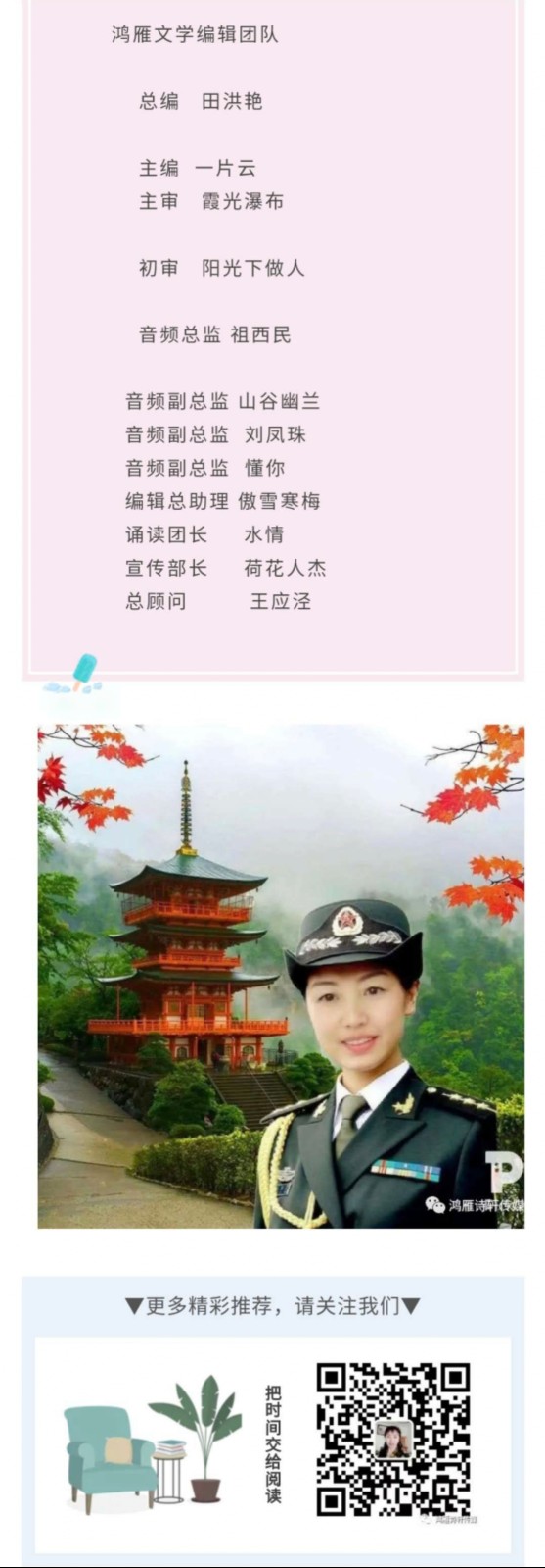 祖西民,网名:民 云中漫步,陕西渭南人,渭南市朗诵协会会员。热爱文字,喜欢朗诵,曾在全民K歌,为你诵读、配音秀等多个平台发表朗诵作品千余首。用文字点亮生活,用声音温暖人生。因为热爱,所以坚持。