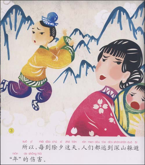 “年”住在深海里,但是每到除夕他就会跑上岸来吃人,乡亲们只能跑到山上躲起来。