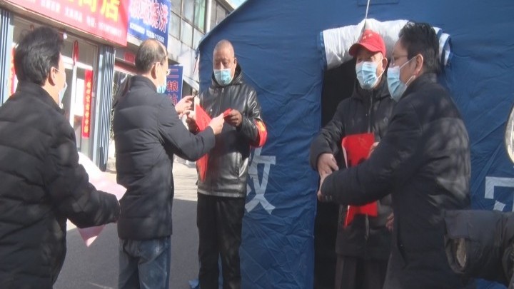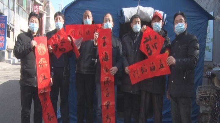防控一线工作人员接过春联,对书法家表示感谢。梁素芳 摄