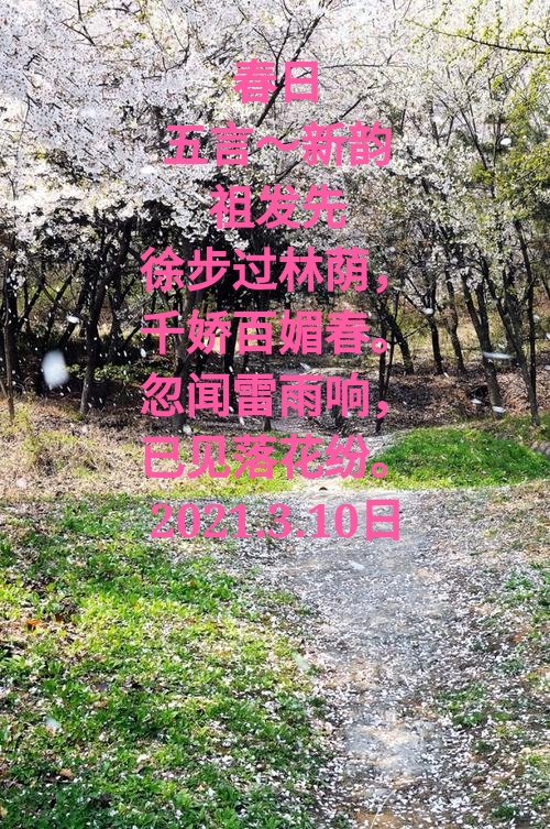 春日 五言~新韵 祖发先 徐步过林荫, 千娇百媚春。