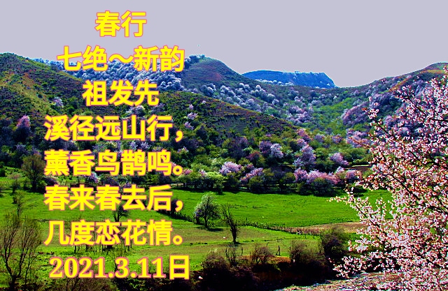 春行 七绝~新韵 祖发先 溪径远山行, 薰香鸟鹊鸣。