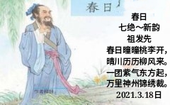 \ 春日 七绝~新韵 祖发先 春日曈曈桃李开, 晴川历历柳风来。