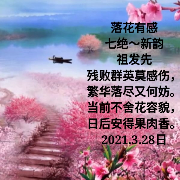 \ 落花有感 七绝~新韵 祖发先 残败群英莫感伤, 繁华落尽又何妨。