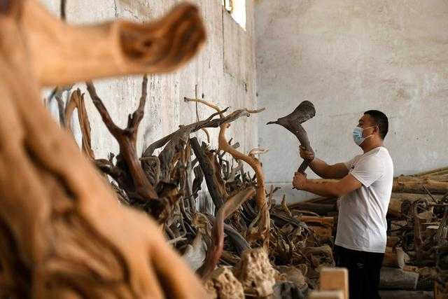8月11日,许红阳在河北省井陉县小作镇许氏木雕工作室选料。