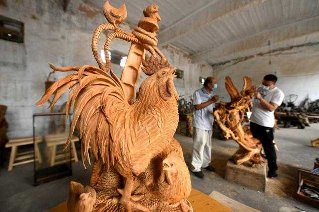 8月11日,许红阳在河北省井陉县小作镇许氏木雕工作室创作。