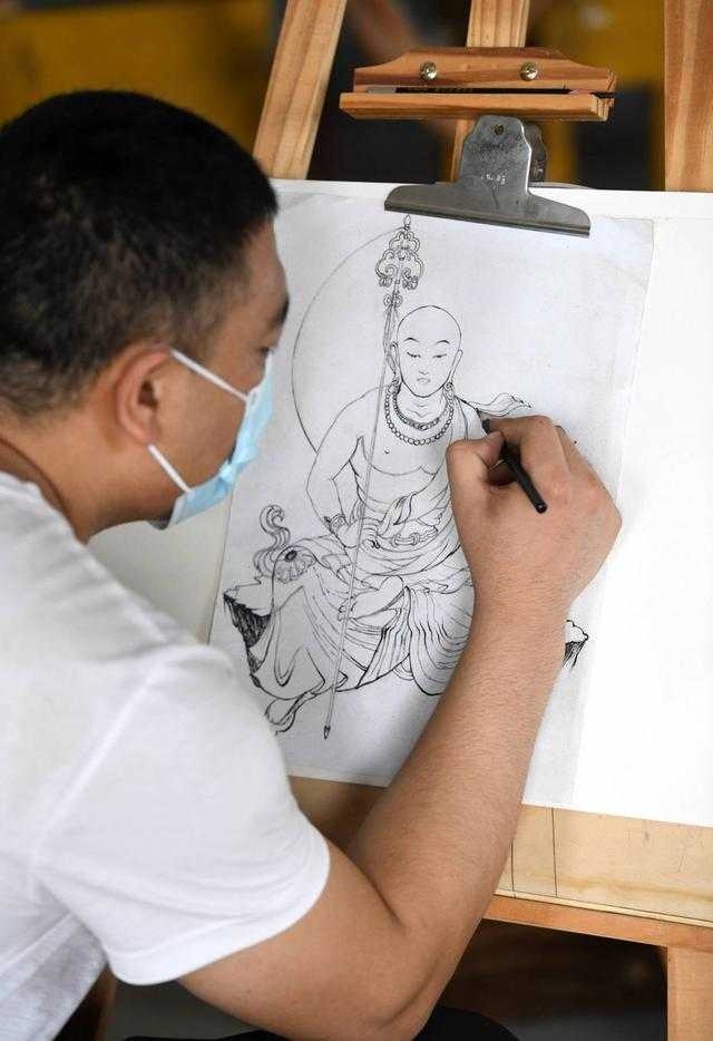 8月11日,许红阳在河北省井陉县小作镇许氏木雕工作室画图。