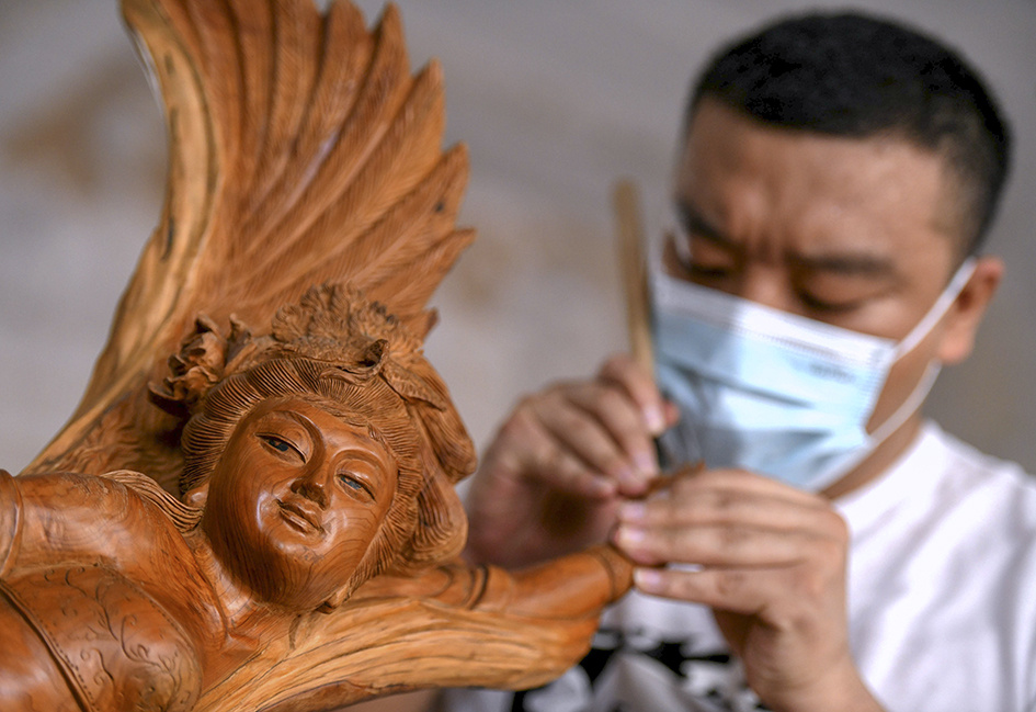 8月11日,许红阳在井陉县小作镇许氏木雕工作室创作。陈其保 摄