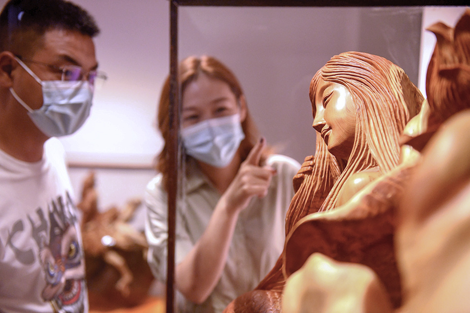 参观者在石家庄市长安区许氏木雕艺术馆欣赏木雕作品。陈其保 摄