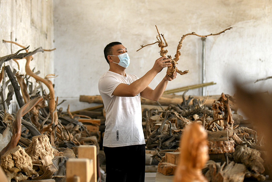 许红阳在井陉县小作镇许氏木雕工作室选料。陈其保 摄