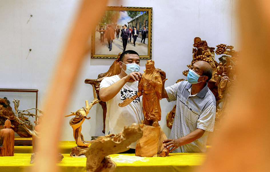 许红阳(右)在井陉县小作镇许氏木雕工作室创作。陈其保 摄