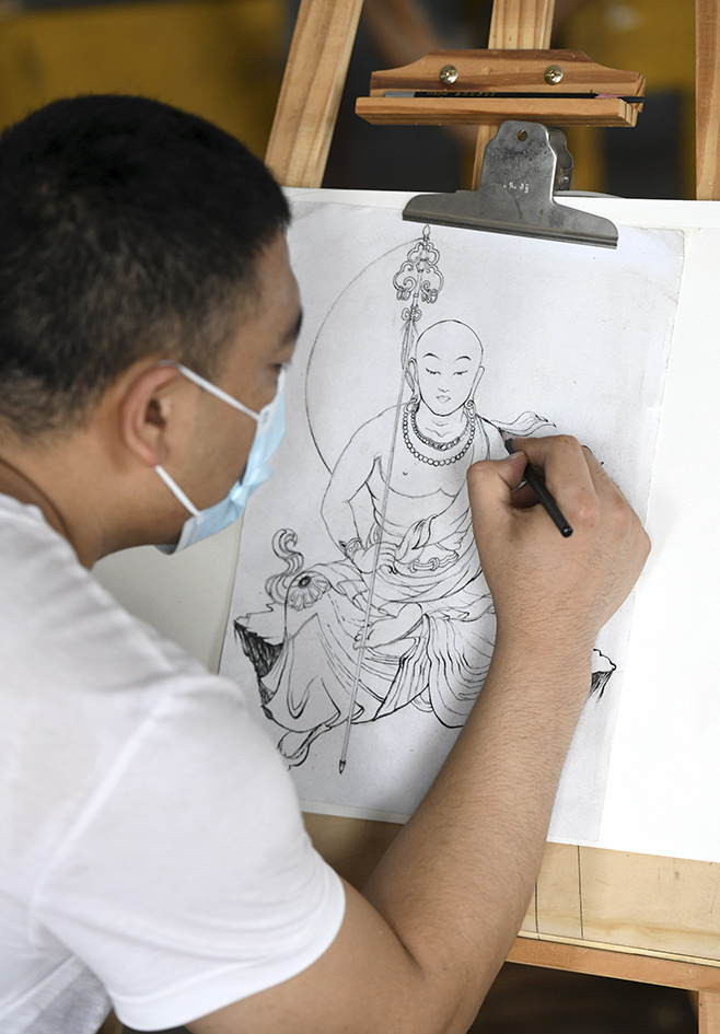 许红阳在井陉县小作镇许氏木雕工作室画图。陈其保 摄