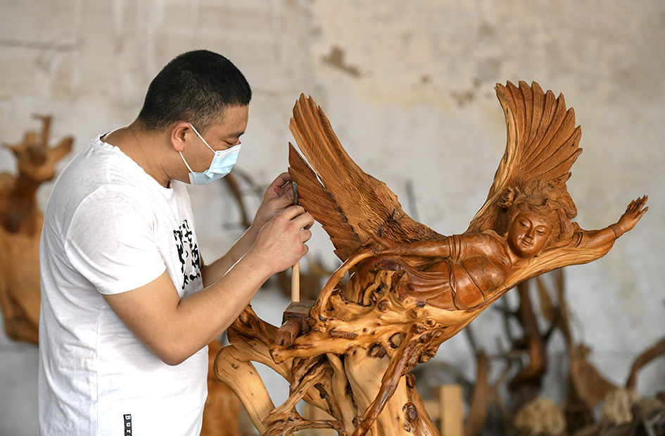 许红阳是河北省省级非物质文化遗产井陉许氏木雕代表性传承人,许氏木雕于2019年入选第七批河北省省级非物质文化遗产名录。许氏木雕发展至今已有300多年的历史,其创作多以太行山的树根为原料,制作技法包括深浮雕、薄浮雕、浅浮雕和镂空雕四种,作品以人物、山水、花鸟等题材为主,制作工序主要有选材、构思、画图、修光、打磨等步骤。