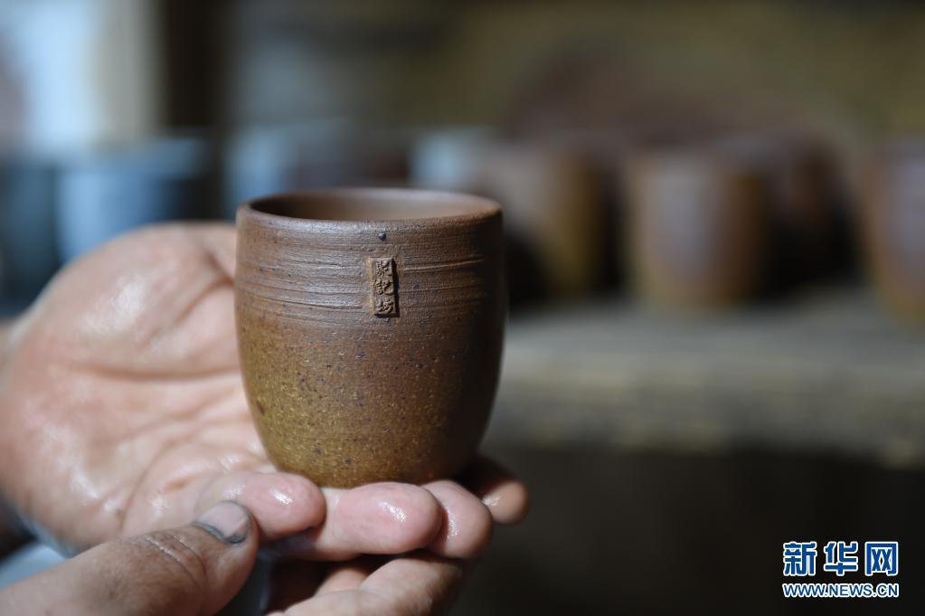 在石家庄市井陉县南横口村,陶瓷艺人李伟展示仿照匣钵缩小制作的匣钵杯。骆学峰 摄