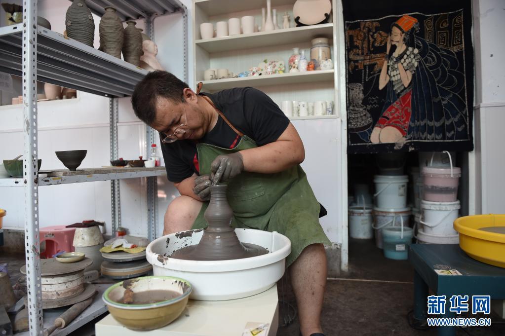 在河北省石家庄市井陉县南横口村“聚记手工坊”,李伟熟练地展示着揉泥、拉坯等陶瓷制作工艺。今年35岁的李伟,一直痴迷于陶瓷制作技艺,2004年开始收集井陉窑旧瓷片进行研究,并按照井陉窑传统工艺手工拉坯制作陶瓷器具。2018年,他辞去工作,在南横口村亲戚家的老房子里开了一间陶瓷工作室。