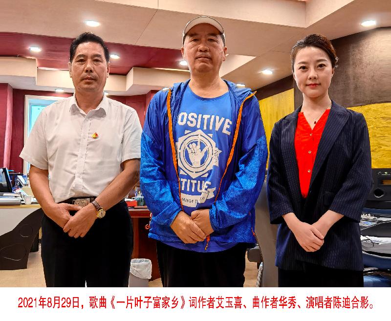本网讯(王振磊)2021年9月12日,由艾玉喜作词、华秀作曲、陈迪演唱的歌颂贵州开阳贡茶的新歌《一片叶子富家乡》正式上线,面向海内外发行。 此首歌词系全国十大杰出新闻人物、公安部一等功臣、吉林省公安英模艾玉喜同志继《九台,一生挚爱》、《九台我可爱的故乡》之后又一力作,受到社会各界的广泛关注和喜爱。