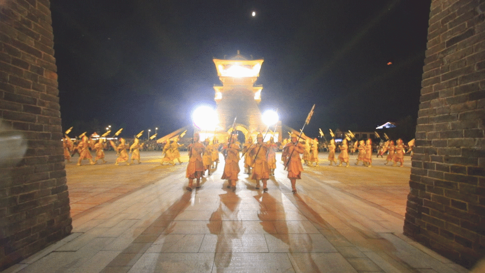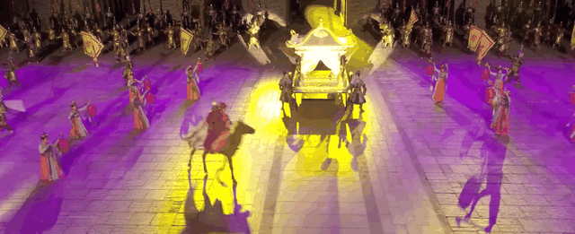 夜幕降临,襄阳城南的夜空亮起绚烂的灯光。数千名游客共同体验了《盛世唐城之大唐倚梦》2021年复演首秀。浩浩荡荡的金甲御林军、一支支优美的盛世舞蹈、一首首响彻天际的大唐天籁、千万组华丽的灯束光影共同编织出一幅盛世唐城不夜盛景!
