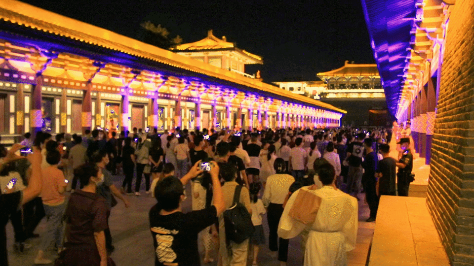 9月15日傍晚,伴随着恢宏大气的音乐,璀璨绚丽的光影,一场行进式夜游演艺在景区徐徐拉开帷幕,标志着盛世唐城夜游正式复演迎客。当晚,来自全国的数千名游客一同入园,体验盛世唐城穿越千年之旅。
