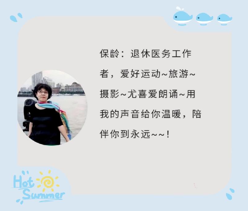 小星星一位普通的上海居民,喜欢看书、喜欢把文字融化在音乐和图画里制作成底版也喜欢制作朗诵小视频。信奉:学无止境!