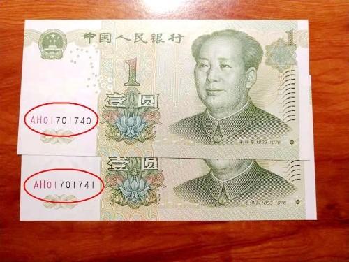 上图中两张一元纸币,也就是今天跟大家说的重点,这两张一元纸币大家有看出什么特殊特征出来吗,首先,它们是属于连号的,大家可以从流水号上面能看出来,其次就是其冠号了,因为它们的冠号都是一样的,而且这个冠号是一元纸币里面的二冠,是由AH两个字母组合而成的,而这种字母组合而成的冠号,可不简单,因为它是一元纸币里面的补号冠,有收藏家表示,像这两张一元纸币,如今在收藏市场上,打包价值700元。