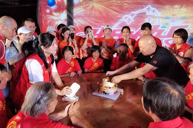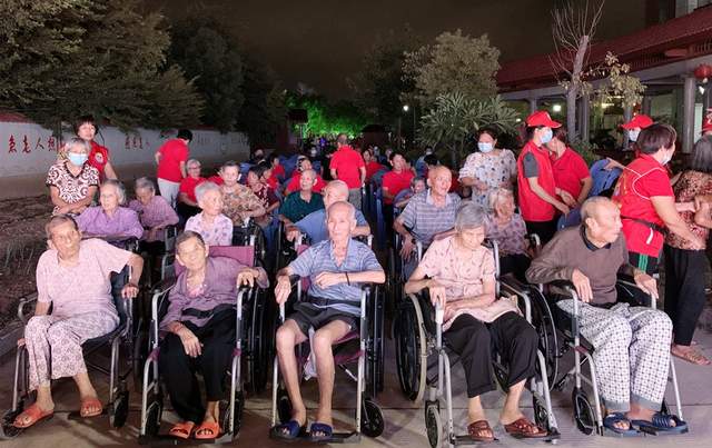 苏垵村志愿者服务队在现场为老人们做着贴心服务工作,鲜红的马甲在夜幕下格外耀眼,穿梭的轻盈身影就像播撒光明的萤火,装点了这片时空的美丽。一位80多岁的老志愿者登台唱革命歌曲,依然声音洪亮,感情充沛。