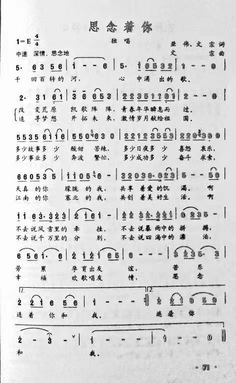 知情是个特殊的群体,在特殊的年代环境下而产生,知青在全世界只有我们中国有。因此我们不能忘记那个年代,忘记那段历史。我们那个年代是情感封闭的年代,上学时男女同学,甚至同桌都不讲话,到了兵团有所改变,在那荒无人烟的环境,只能靠我们互相帮助,战胜困难。诗歌感染了我,正琢磨如何谱成曲,亚伟将改好得歌词发了过来,电话里说:“老田,歌词改好,給哼个曲吧。”歌词改得好,40年抹掉了,不受年代的约束,写出了当年知青对爱的朦胧,对爱的渴望。我反复构思,曲调要上口流畅,好唱好听,不能像老兵团战士歌曲那样豪迈有力,经过多次起草,修改,征求意见,总算把谱曲完成了,原歌词就一段词,发表在黑龙江兵团网,后我感觉歌词不够完善,40年间的岁月只描写过去,没有现在,于是与词作者沟通,是否再加上第二段词,描写现在。亚伟说“我没词了”,委托让我写,有点犯难了,我肚子里那点墨水……怕胜任不了,这段词费了很大功夫,“照葫芦画瓢”,反复修改,征求意见,总算完成了。此歌发表在2010年2月(歌曲月刊)。