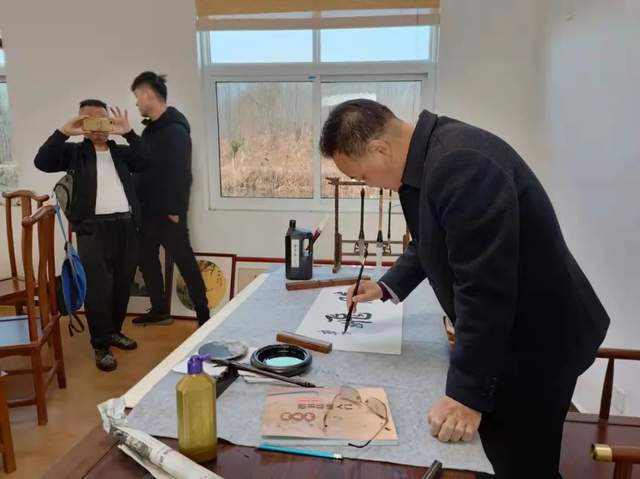 纸宣如练,墨浪蒸腾,万事具备,只等书家携墨登场。因是老家,继同兄先写,但见他悬腕凝墨,落笔成行,颇有执剑仗言之豪气。