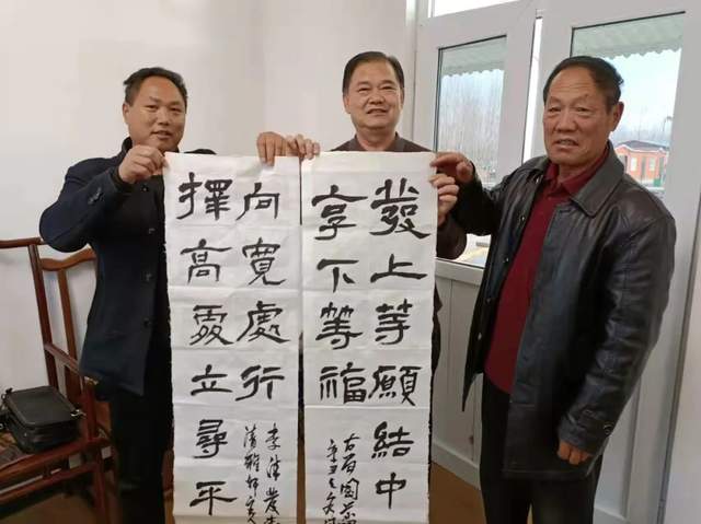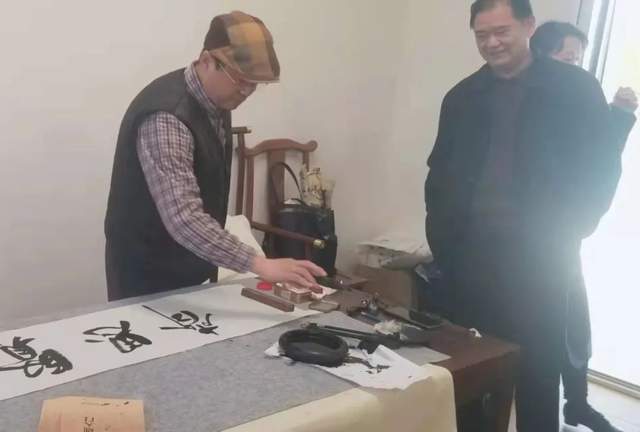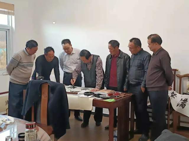 好书者丁同凯,自己好写,但更求墨心切,尤其熊继雨这样大腕级的书画家能亲来丁楼,不求几幅墨宝,实为良机错失。因而,他早早就在自己习墨的书案间备好了文房四宝……清发与继同二兄见状,显然被写字的欲望所驱使,个个去衣挽袖,摩拳擦掌,同凯则忙着寻刀裁纸。刀不见,只寻来了一把剪子,问“行吗”?继同兄顺手接过,说“可”,便亲自动手。清发兄则阵前研墨,丝丝入扣。继雨兄与秋芳妹子则忙中偷闲,用手中高分贝手机抓拍瞬间……