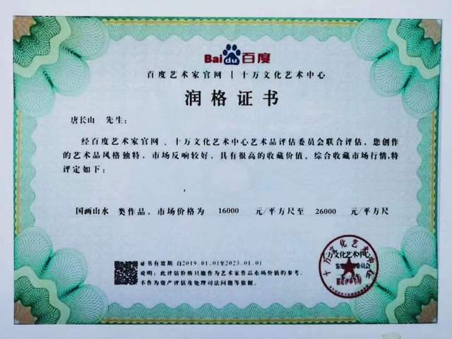 唐长山,职业画家,毕业于中国人民解放军艺术学院,进修于北京中国画山水高研班,中国美术家协会会员,国家级高级油画师、北京名家画院理事、北京时代金城书画院院士、山东儒家画院副院长、中国教育电视《水墨丹青栏目组》水墨丹青书画院会员、中国教育部关工教授于“德艺双馨”艺术家称号。