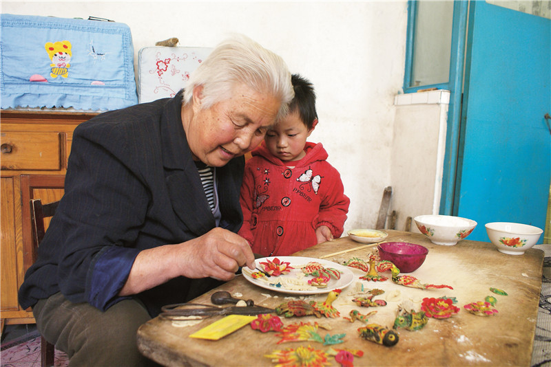 南张村面塑主料为面粉,辅料有江米面、甘油、蜂蜜和食用色素。80多岁的郝雨庭是南张村民俗面塑的传承人之一,她十几岁跟着母亲捏供品,二十岁时就能独揽全活,是村里面塑有名的“巧女”。郝雨庭每年从正月初二就开始忙碌,揉面、醒面、调色、捏面,直到正月十八,制作面塑作品百余件,她还为村里人普及制作面塑花样,村民们的面塑手工技艺受益良多。