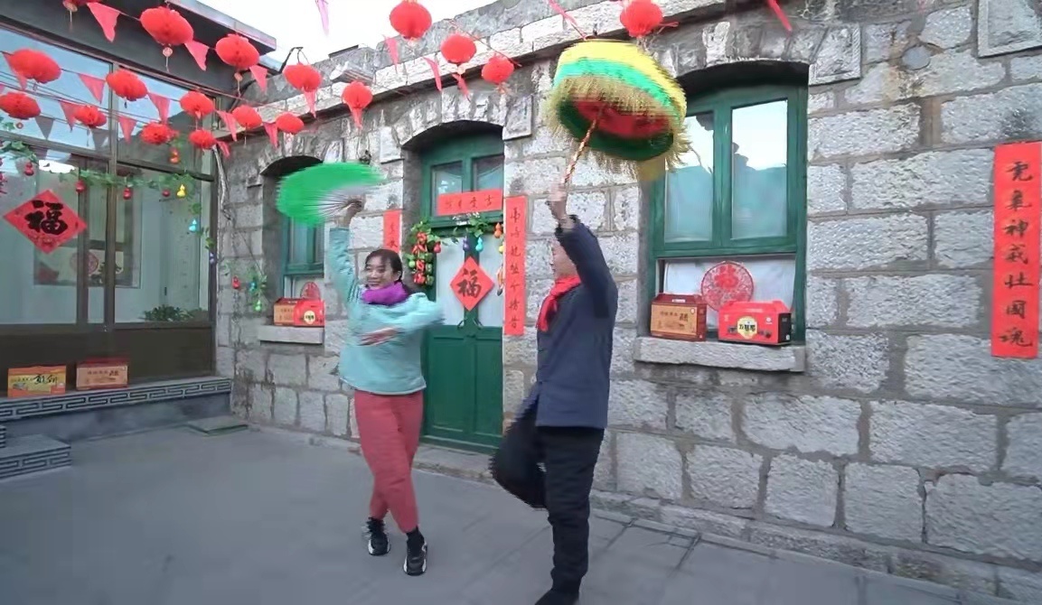 如果最家常的撒糕,是用乡间美食寓意年安高升,那么极具地域文化特色的井陉拉花,则跳出了井陉人的浓浓乡情。跟随着直播镜头,在这石头庭院的另一侧,井陉县文化馆的舞蹈老师张勇和于俊慧已穿戴好行头,手持伞扇、抖动彩绢、拧肩翻腕,翩然起舞,把现代井陉的气质和风貌融在拉花独有的一招一式里。