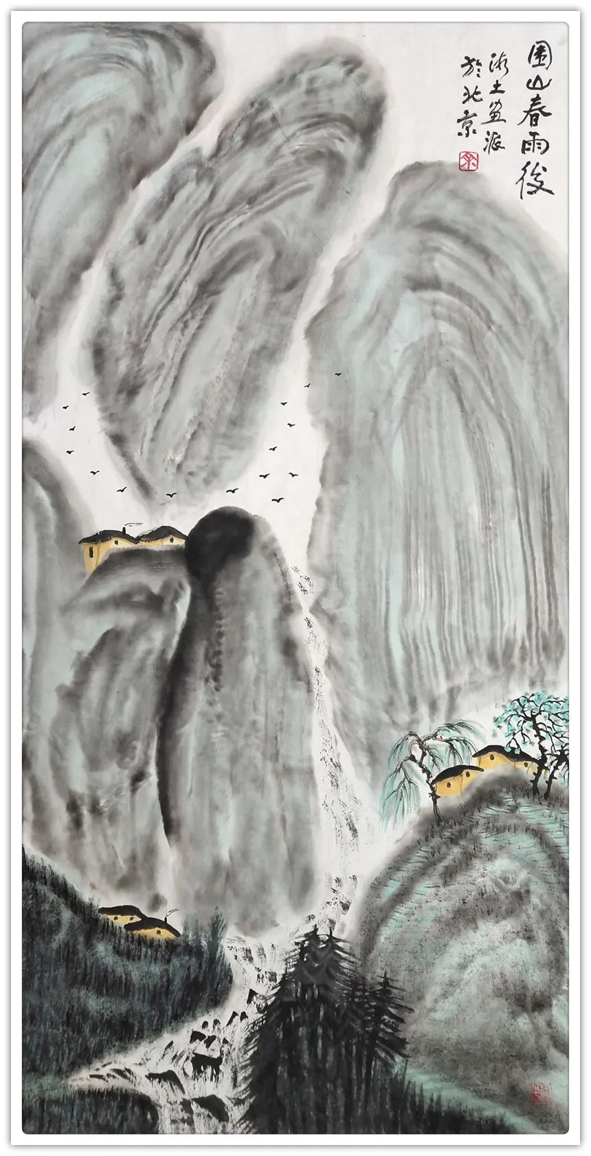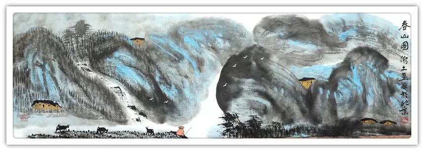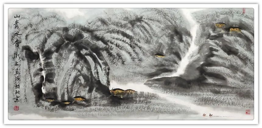 泼墨山水,妙在于墨法,升华于设色,先生之作,亦是如此。其墨首观破墨,而破墨之难,是难在了如何掌握干湿程度上,倘若墨过于湿润,则渗化太快,尽显无骨臃肿,如若墨过于干燥,则难融洽,又显突兀苍老。而今日余和平先生深谙用墨法门,其用墨之功,早已达炉火纯青之境,无论是破墨还是破色,皆能运用自如,曲尽其妙,通幅墨法,是谓于浓淡中透自然,虚实相应,实虚相融,层次渗透,浑沦华滋!如此墨功,意趣横生,实非平常画者能所为之!