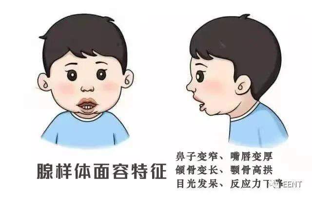 此外,有研究表明打鼾会影响儿童的身高、体重的增长。同时由于长期张口呼吸,患儿还可能表现出明显的颌面部发育畸形,即“腺样体面容”。