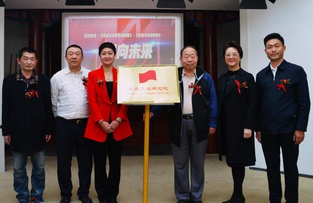 (上图)中国现代文学馆原副馆长、北京文德堂书画院院长刘泽林,当剧者谜(北京)文化传媒有限公司董事长付燕菲,北京文颐富石文化传媒有限公司总经理、北京文德堂书画院办公室主任兼副秘书长曲叙锋,中国太平区域总经理程云松,周恩来精神研究会办公室主任肖敏,红色文化研究院办公室主任王峰一起为红色文化研究院揭牌。