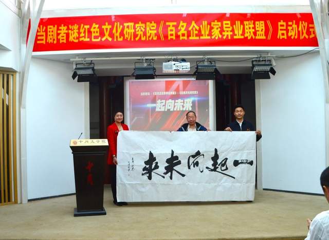 (上图)北京文德堂书画院院长刘泽林特意书写《一起向未来》墨宝表示祝贺,北京文颐富石文化传媒有限公司总经理曲叙锋、当剧者谜文化传媒公司总经理付艳菲合影留念。